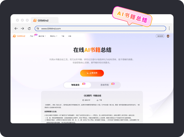 GitMind AI书籍总结工具帮你高效整理书籍内容,快速生成结构化的思维导图摘要。